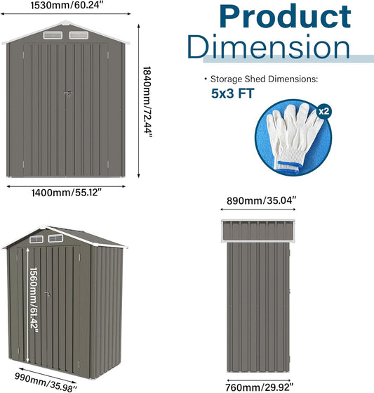 ARMSET 5x3 FT Metal Outdoor Storage Shed for Patio & Balcony - Waterproof Small Shed for Garden Storage, Lockable Vertical Tool Shed Cabinet for Backyard, Bike Parts & Everyday Sundries