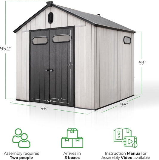 Greesum 8×8 FT Plastic Outdoor Storage Shed with Floor, Resin Sheds with Window and Lockable Door, Weather Resistant Organization for Garden, Lawn, Pool Supplies, Beige