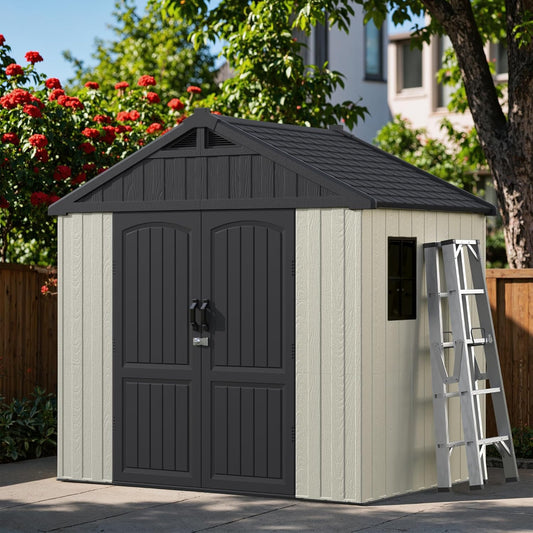 Greesum 8×6 FT Plastic Outdoor Storage Shed with Floor, Resin Sheds with Window and Lockable Door, Weather Resistant Organization for Garden, Lawn, Pool Supplies, Beige