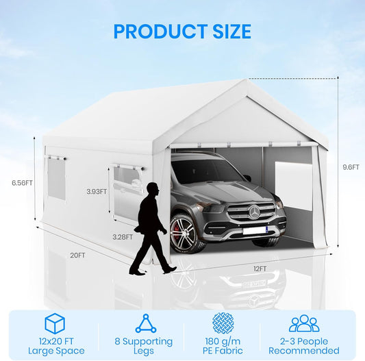 Carport 12x20 FT Heavy Duty, Outdoor Portable Garage with Removable Sidewalls & Doors, Waterproof, UV-Resistant Canopy Shelter for Vehicles, Boats, RVs, Trucks, All-Season Car Port,White