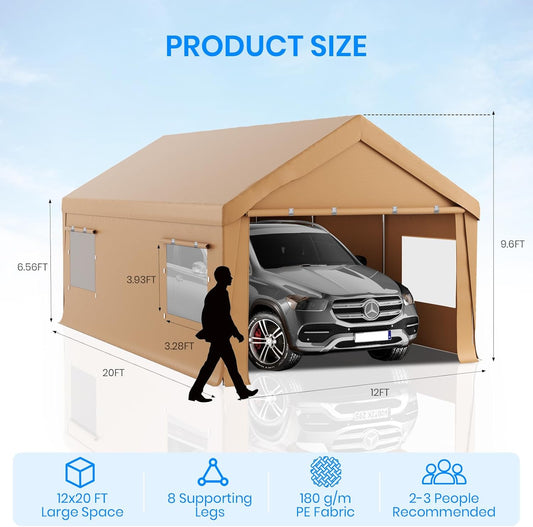 Carport 12x20 FT Heavy Duty,Outdoor Portable Garage with Removable Sidewalls & Doors, Waterproof, UV-Resistant Canopy Shelter for Vehicles, Boats, RVs, Trucks, All-Season Car Port, Gray