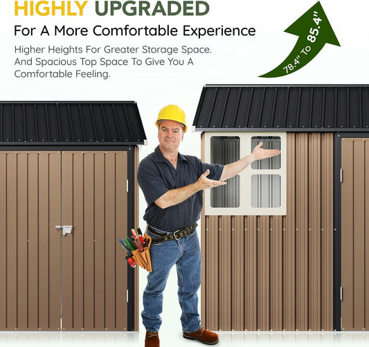 Breezz 6X8FT Outdoor Steel Storage Shed with Frame Floor,Clear Window, Lockable Doors, Weather-Resistant Metal Tool Shed for Garden, Backyard, Patio, and Utility Storage Brown