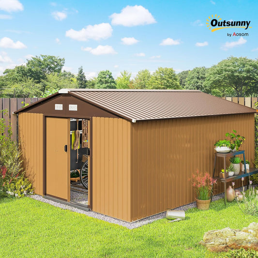Outsunny 11' x 9' Outdoor Storage Shed, Garden Tool Metal Shed with Foundation Kit, Double Lockable Door, Air Vents and Sloping Roof, for Backyard, Patio, Lawn, Brown