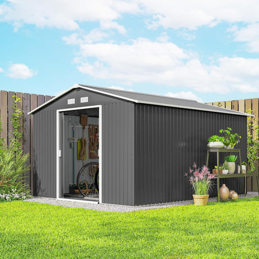 10 x 12 FT Outdoor Storage Shed, Metal Garden Tool Shed with Slooping Roof, Lockable Doors and Windows, Easy to Assemble for Garden, Patio, Lawn, Grey