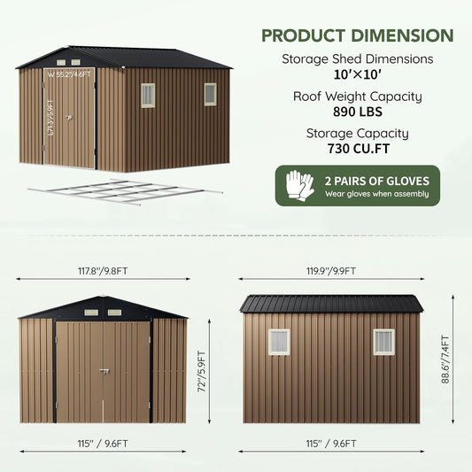 10x10 FT Outdoor Metal Storage Shed, Double Swing Doors, 2 Clear Windows,Tool Shed for Garden, Patio, Backyard Brown