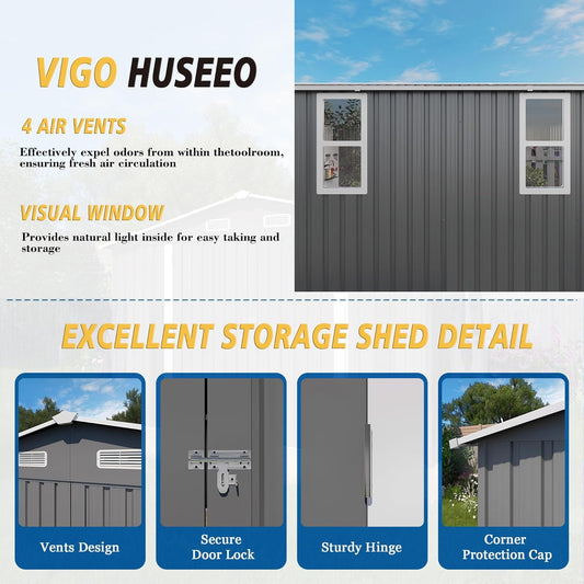 10 x 12 FT Large Outdoor Storage Shed w/ 2 Clear Window, Heavy Duty Metal Garden Sheds with Lockable Door & Air Vents, Waterproof Tool House for Bicycles, Tools, Backyards, Patios, Lawns, Gray