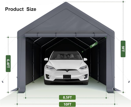 COBIZI Carport 10x20ft Heavy Duty Portable Garage, 2.0 Powder Coated Frame(Better Than Galvanized), Waterproof Shelter with Built-in Sandbags, for Car/Boat/SUV, Gray