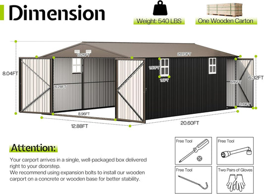 13'x21'x11' Oversized Metal Carport, Steel Heavy Duty Carport for All-Weather, Permanent Shelter for Bass Boats, Pickup Trucks, and Tractors, N.W. 660 Lbs