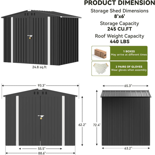 COMHOMA Shed Outdoor Storage Shed Metal,Lockable Doors Tool Sheds with Sloping Roof,Steel Garden Shed with Air Vent for Backyard,Patio,Lawn,Poolside (Grey, 8'*6')
