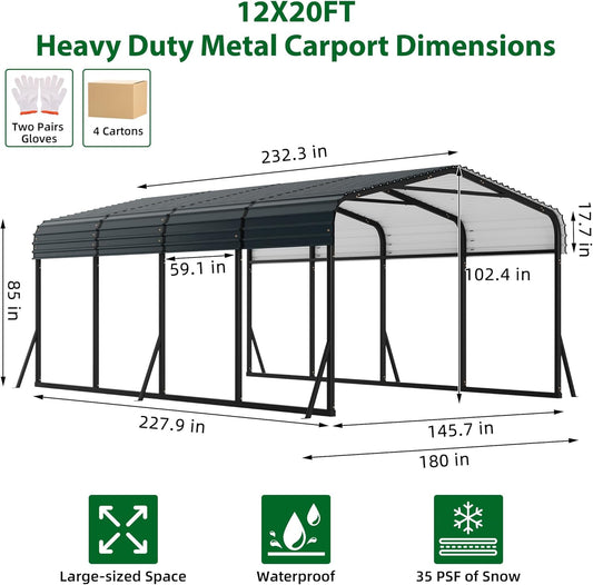 12x20 FT Metal Carport, Enclosed Car Port with Reinforced Frame and Steel Roof for All-Weather Use, Metal Garage Shed for Full-Sized Pickup Trucks