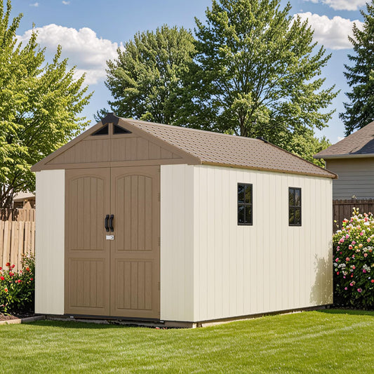 Patiowell 8 x 10 FT Resin Outdoor Storage Shed with Floor, Plastic Shed with Window and Lockable Door for Garden, Backyard, Tool Storage Use, Easy to Install in Beige (Kick-it Shed)