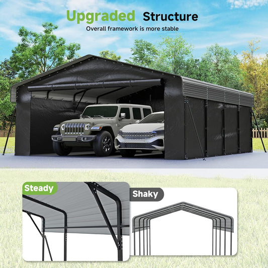 Walsunny Metal Carport 20x20 FT Heavy Duty Carport Canopy with Enhanced Base, Outdoor Car Shelter with Galvanized Steel Roof and Frame Garage for Truck, SUV, Boat, Black