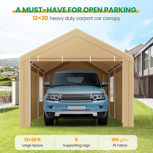 COBIZI Carport Canopy 12x20 Heavy Duty Car Tent Garage, Galvanized Frame Car Canopy Outdoor Shelter Waterproof & UV Protected with Built-in Sandbags & All-Season Tarp for Car Boat Truck, Khaki