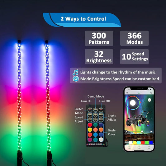 2Pack 2FT Fat Whip Lights,LED Whip Lights with Strobe Light Spiral RGB Chasing Lighted Antenna Whips W/App & Remote Control Music Whip Light for UTV ATV RZR Polaris SXS Can-Am X3 Off-Road Truck