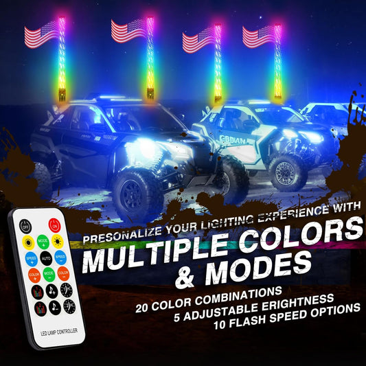 2PCS 4FT Fat Whip Lights for UTV ATV with Spring Base, Led Fatty Whip Light W/Rocker Switch & 6 Flags, Brighter Spiral Chasing Lighted Antenna Whip with APP & Remote Control for RZR SXS Can-Am