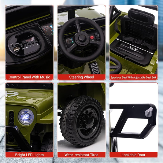 OLAKIDS Kids Ride On Truck, 12V Electric Vehicle Jeep Car with Remote Control, Toddlers Battery Powered Toy with 2 Speeds, Spring Suspension, Double Open Doors, LED Lights, Music, TF, USB, Mp3 (Black)