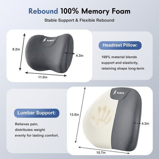 FLORICH Lumbar Support Pillow and Neck Pillow for Office Chair Car, Ergonomic Memory Foam Back Support for Office Gaming Chair Driving Seat Wheelchair, Relieves Neck, Back & Sciatica Pain – Grey