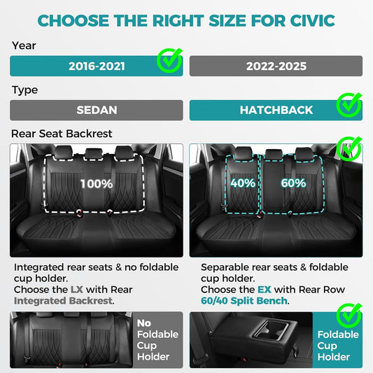 Seat Covers for Honda Civic Hatchback EX, Sport Touring, EXL 2016 2017 2018 2019 2020 2021, Faux Leather Car Seats Cover Full Set(Rear Row 40/60 Split & Folding Backrest)-Black