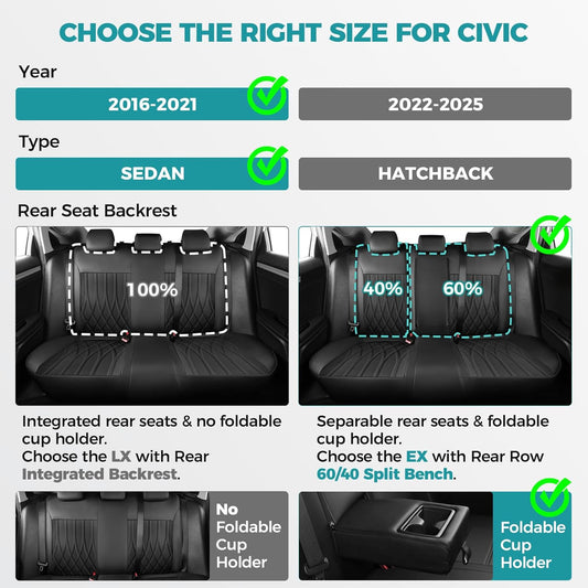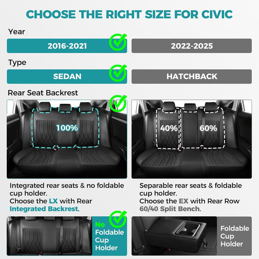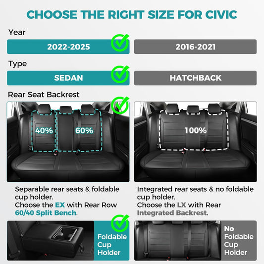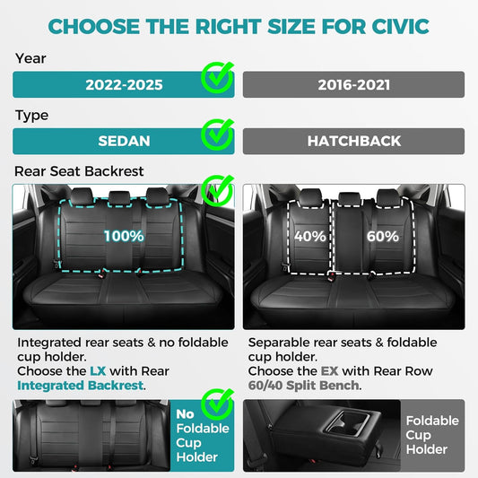 Seat Covers for Honda Civic Sedan 4DR Sedan EX 2022 2023 2024 2025.Faux Leather Car Seats Cover Full Set (Rear Row 40/60 Split & Folding Backrest)-Black