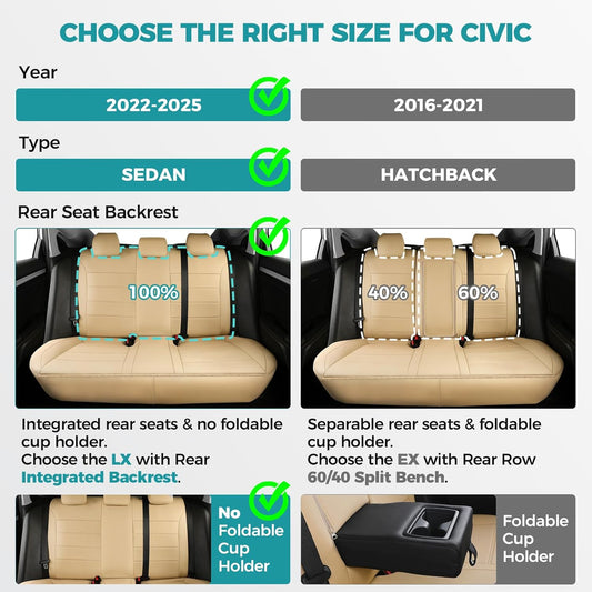 Seat Covers for Honda Civic Sedan 4DR Sedan LX 2022 2023 2024 2025, Leather Car Seats Cover Full Set,(Rear Row Solid Folding Backrest)-Beige