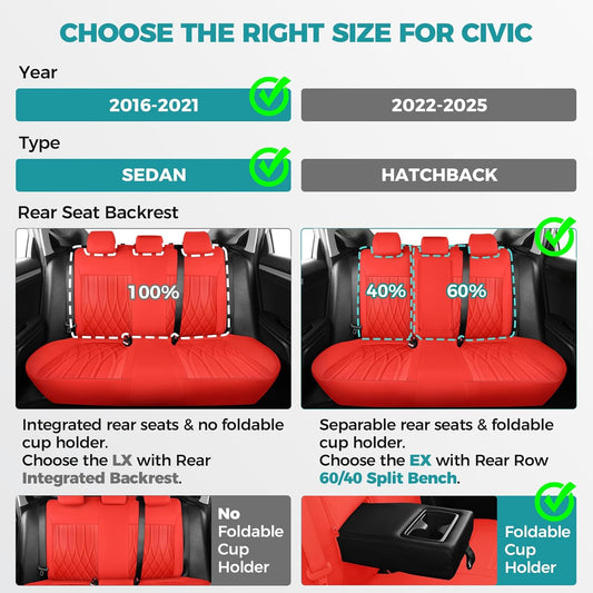 Seat Covers for Honda Civic Sedan EX-L, EX-T, EX, Touring, LX-P, Sport 2016 2017 2018 2019 2020 2021, Faux Leather Car Seats Cover Full Set(Rear Row 40/60 Split & Folding Backrest)-RED