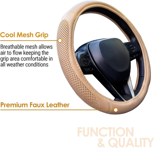 Cool Mesh Grip Car Steering Wheel Cover with Breathable Grip, Premium Faux Leather, Universal fit for All Cars, SUV, Mini-Van and Mid-Size Trucks with Steering Wheel Size 14.5" to 15"