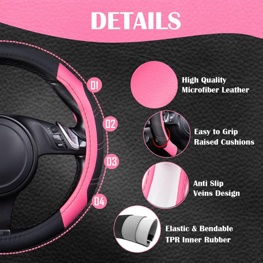 CAR PASS Line Rider Microfiber 14 Inch Leather Sporty Steering Wheel Cover Universal Fits for 95% Truck,SUV,Cars, Anti-Slip Safety Comfortable Desgin (Black Pink)