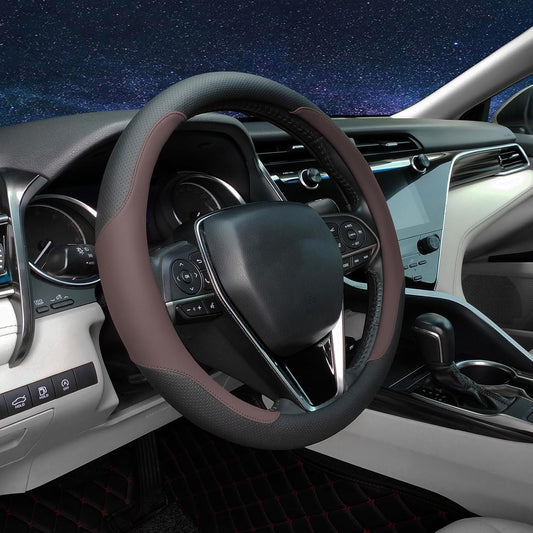 Steering Wheel Cover Standard Size Medium 14.5-15 inch, Breathable Microfiber Leather, Anti-Slip, Soft Grip, Universal Fit for Cars SUVs Trucks, Black and Chocolate Brown