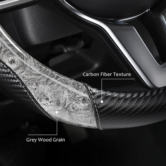 Wood Grain Steering Wheel Cover Carbon Car Steering Wheel Covers 14 1/2-15 inch with Coasters Microfiber Leather Splicing Breathable Anti-Slip Durable Universal Steering Wheel Protective - Gray