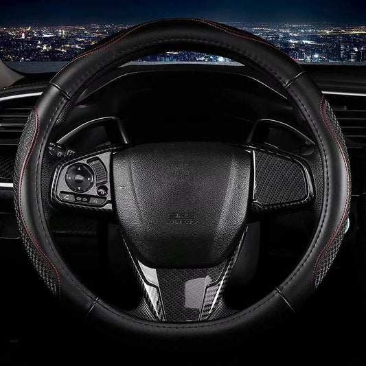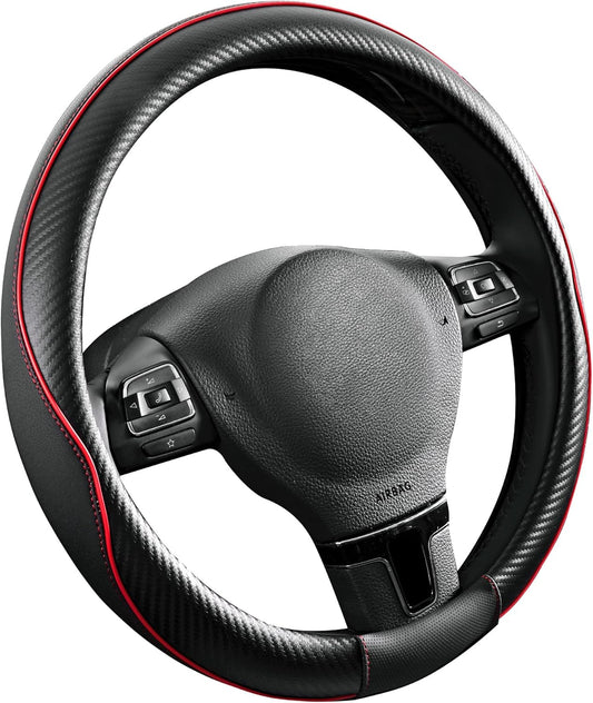 PIC AUTO Steering Wheel Cover, Red Piping Leather, Sports Carbon Fiber and Super Breathable Leather, Universal 14.5-15.5 Inch Anti-Slip Steering Wheels Accessories for Men & Women