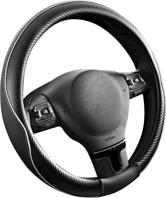 PIC AUTO Steering Wheel Cover, Black Piping Leather, Sports Carbon Fiber and Super Breathable Leather, Universal 14.5-15.5 Inch Anti-Slip Steering Wheels Accessories for Men & Women