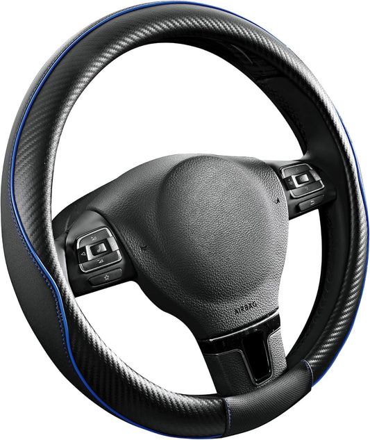 PIC AUTO Steering Wheel Cover, Blue Piping Leather, Sports Carbon Fiber and Super Breathable Leather, Universal 14.5-15.5 Inch Anti-Slip Steering Wheels Accessories for Men & Women
