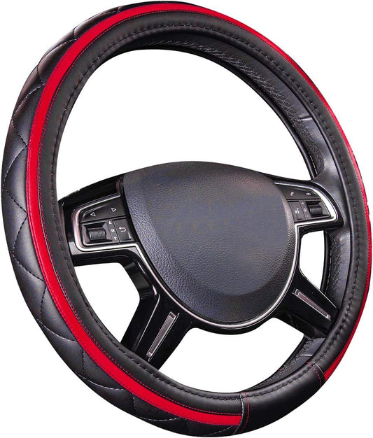 CAR PASS Sporty Quilting Leather Universal Fit Steering Wheel Cover,Fit for Suvs,Vans,Sedans,Trucks for 14.7" to 15" (Black & Red)