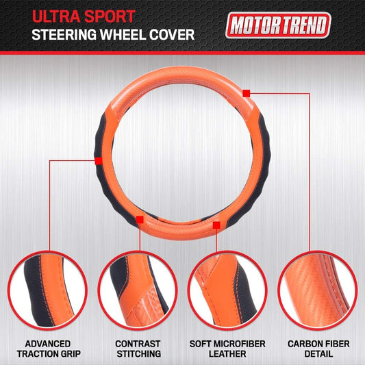 Motor Trend SW-812 Orange Ultra Sport Pebbled Leather Steering Wheel Cover with Carbon Fiber Detail-Universal Fit for Standard Sizes 14.5 to 15.5 inches Black