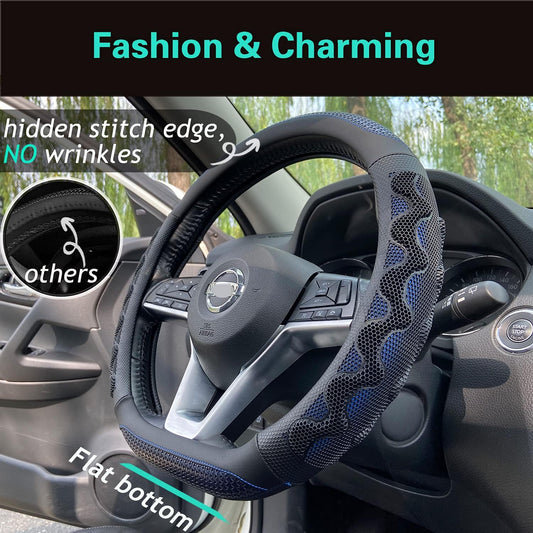 PINCTROT D Shaped 14.5-15 Inch Steering Wheel Cover Great Grip with 3D Honeycomb Anti-Slip Design, Flat Bottom 14.5-15 Inch (Blue)