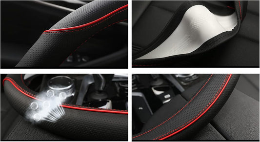 Leather Car Steering Wheel Cover, Non-Slip Car Wheel Cover Protector Breathable Microfiber Leather Universal Fit for Most Cars (Black & Red)