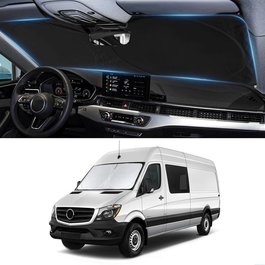 Custom Fit Benz Sprinter Windshield Sunshade for 2007-2025 2026 Mercedes Benz Sprinter Freightliner Cargo Crew Passenger Motorhome Accessories Window Shades Cover for Windshield Sun Visor Blocks UV
