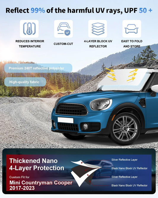 Sun Shade for 2017-2024 2025 Mini Countryman Cooper F60 SUV Windshield Sunshade Accessories 2-Layer Car Sun Shield Sun Visor Window Shade Blocks UV Rays Car Accessories