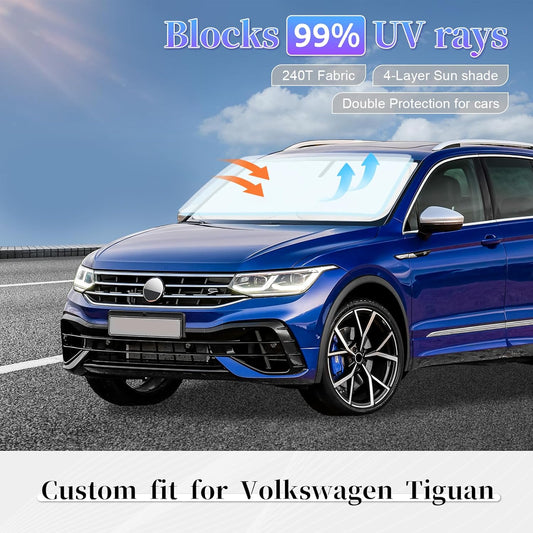 Sun Shade Sunshade for Volkswagen Tiguan 2018-2023 2024 2025 Windshield Cover, 4-Layer Front Window Shade Custom fit Tiguan Sun Visor 240T Retractable Shade Blocks UV Rays Cooler Car Accessories