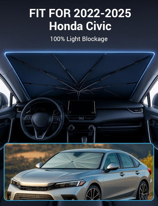 Proadsy Windshield Sun Shade Umbrella for Honda Civic 2022-2025 2026 Foldable Car Umbrella Sunshade with Soft TPU Handle Spring Structure Crystal Cooling Material Protect Car from Rays & Heat