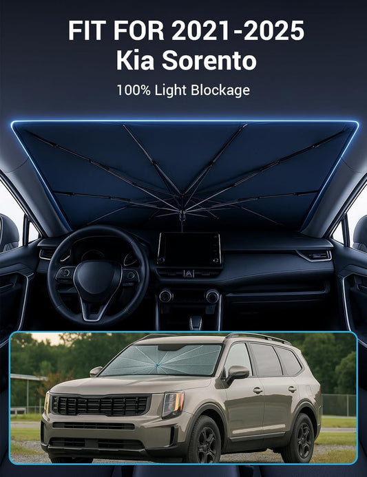 Proadsy Windshield Sun Shade Umbrella for Kia Sorento 2021-2025 2026 Foldable Car Umbrella Sunshade with Soft TPU Handle Spring Structure Crystal Cooling Material Protect Car from Rays & Heat
