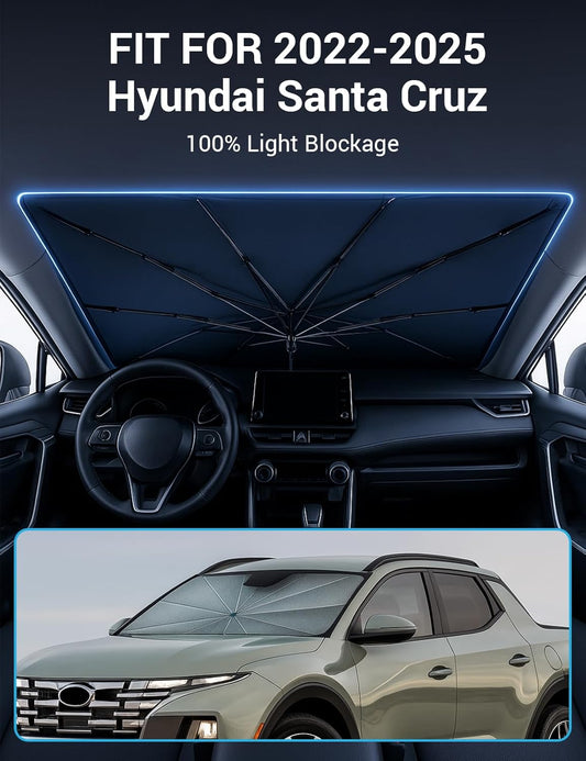 Proadsy Windshield Sun Shade Umbrella for Hyundai Santa Cruz 2022-2025 2026 Foldable Car Umbrella Sunshade with Soft TPU Handle Spring Structure Crystal Cooling Material Protect Car from Rays & Heat