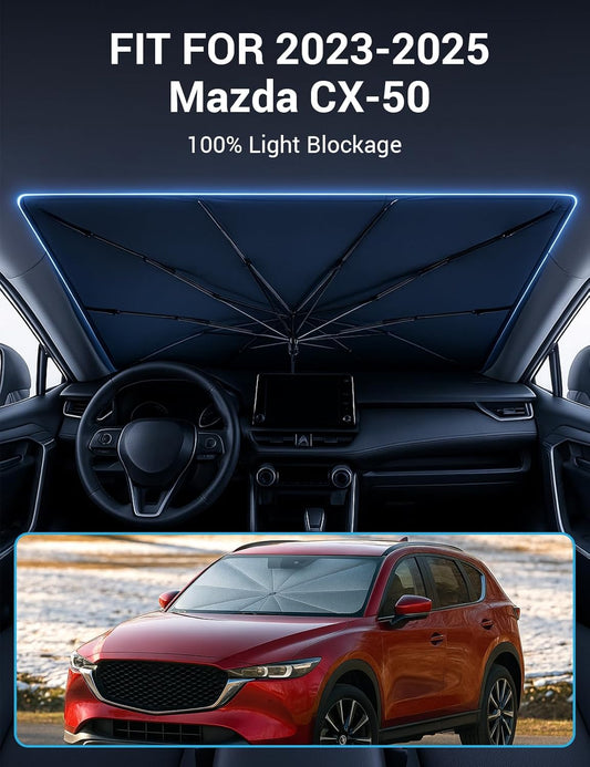 Proadsy Windshield Sun Shade Umbrella for Mazda CX-50 2023-2025 2026 Foldable Car Umbrella Sunshade with Soft TPU Handle Spring Structure Crystal Cooling Material Protect Car from Rays & Heat