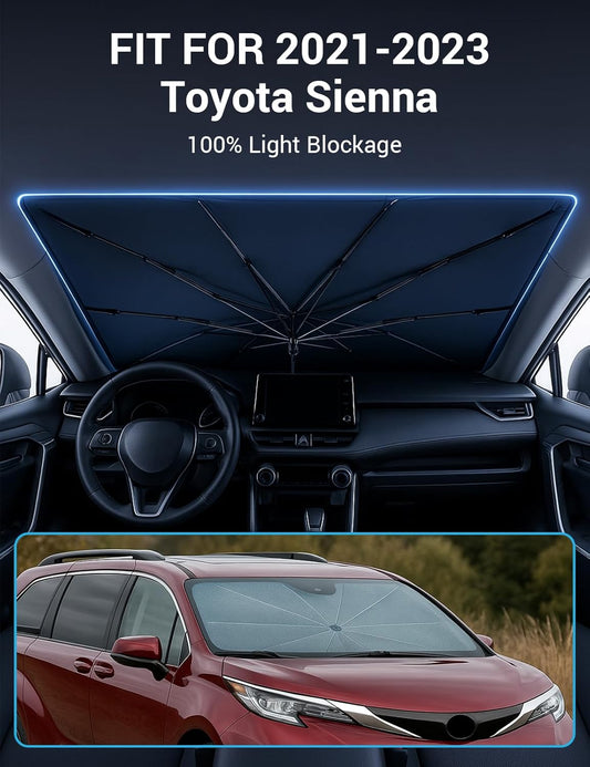 Proadsy Windshield Sun Shade Umbrella for Toyota Sienna 2021-2025 2026 Foldable Car Umbrella Sunshade with Soft TPU Handle Spring Structure Crystal Cooling Material Protect Car from Rays & Heat