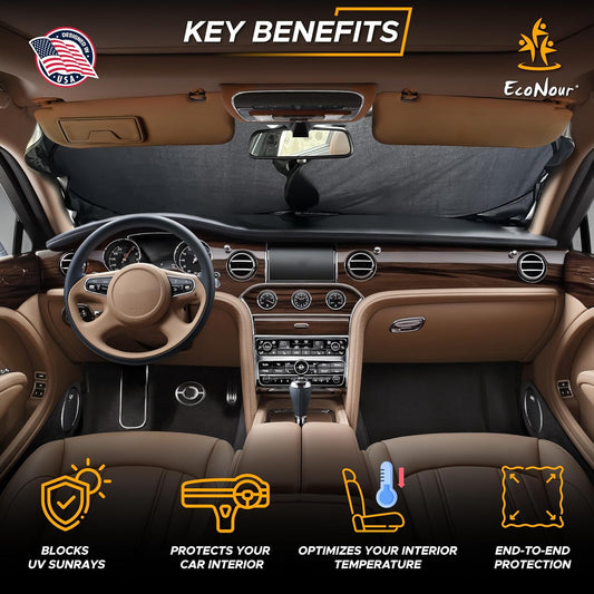 EcoNour Car Windshield Sun Shade | Premium 300T Polyester Automotive Heat Shield | Sunshade for Car Windshield, Front Window Sun Shade, UV Glare Protection | Fits Sedans, Mini SUVs, Hatchbacks (64x32)