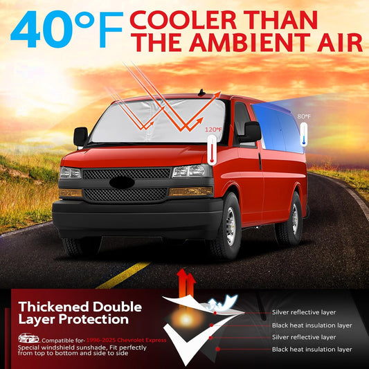 KAYZT Windshield Sun Shade for 1996-2025 2026 Che-vrolet/Chevy Express Cargo Van 1500, 3500, 4500, LS, LT Foldable Sunshade Front Window Custom Fit Car Accessories