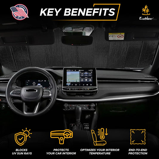 EcoNour Accordion Windshield Sun Shade for Jeep Wrangler | Car Shade Front Windshield Designed for Jeep Wrangler| Dashboard Sun Visor for UV and Heat | XS 53 x 17 inches