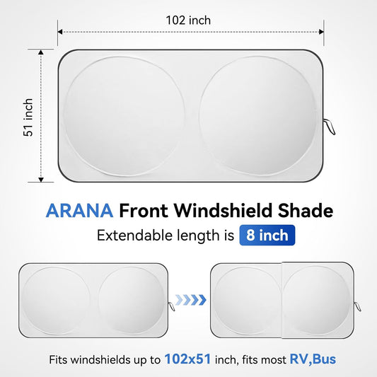ARANA RV Windshield Sun Shade with UV Protection, Foldable Sunshade for RV Front Window, Retractable Windshield Cover Sun Shades Keep Car Interior Cool, Fit RV, Bus,Motorhome, Large 102"x51"