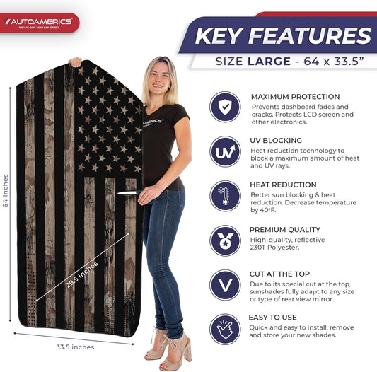 Autoamerics Truck Windshield Sun Shade with Storage Pouch & Anti-Slip Dash Pad - Foldable B&W Camo USA Flag Design - Fits Most SUVs & Trucks - Blocks UV Rays and Keeps Car Cool | XL (66 x 36 inches)