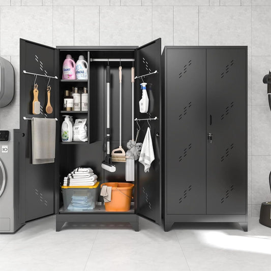 GREATMEET 72.8" H Metal Storage Cabinets with Doors and Shelves, Grey Broom Closet Storage Cabinet, Broom and Mop Utility Cabinet for Home,Kitchen,Garage